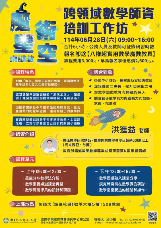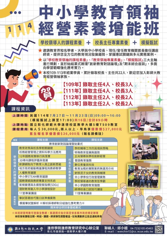 說明: 一、 「魔術星空數學師資培訓工作坊」 (一) 課程特色:本課程邀請全臺抱走最多教育獎的洪進益數學老師教導各位學員,設計創新課程方案,在課堂中模擬現實環境,以遊戲、活動、任務等方式,讓學生融入教學情境,認識數學之美! (二) 課程時間:114年06月28日(六) 09:00~16:00,合計6小時,公務人員及教師可登錄研習時數。 (三) 課程費用:3,000元(含教材費-報名即送八樣超實用數學魔數教具)。早鳥報名享優惠2,600元。 二、 「114年中小學教育領袖經營素養增能班(原「中小學校長、主任經營素養培訓班」)」 (一) 課程特色: 1、 邀請教育界知名學者、大學與中小學校長,及現任/曾任教育機關首長擔任講座師資,提供您全方位的教育現況發展趨勢,掌握應試關鍵與多元實務案例。 2、 以「學校教育領袖的課程素養」、「教育領袖專業素養」、「模擬甄試」三大主軸進行規劃,並於始結業式辦理「創新教育對話論壇」及「期末綜合座談」,以多面向學習範疇強化應考實力。 3、 聘資深中小學校長組成師傅導師群,透過完整紮實的筆試輔導練習及模擬面試實務,成為您在邁向學校教育領袖道路上的堅強後盾。本校109-113年結業學員,累計共錄取主任12人、校長10人,歡迎您加入彰師大教育經營領袖家族。 (二) 適合對象:規劃提升個人領導素養,期待成為有效能的學校行政領導人之現職教師皆歡迎報名參加。 (三) 課程時間:114年07月27日至11月23日,09:00~16:00 (模擬甄試上課至17:00)共16日,合計89小時,公務人員及教師可登錄研習時數。 (四) 課程費用:新台幣30,000元。報名享優惠27,000元、舊生報名享優惠26,000元(報名請備註)。 三、 報名步驟:線上報名,請至本校進修學院報名管理系統報 名 。如第一次報名,請先申請帳號。(https://aps.ncue.edu.tw/cee/index.php) 四、 如有相關問題,請向本校進修學院進修教育研究中心洽詢 : 04-7232105 分 機 5463 邱 小 姐 , E-mail :wenchin12@cc.ncue.edu.tw。