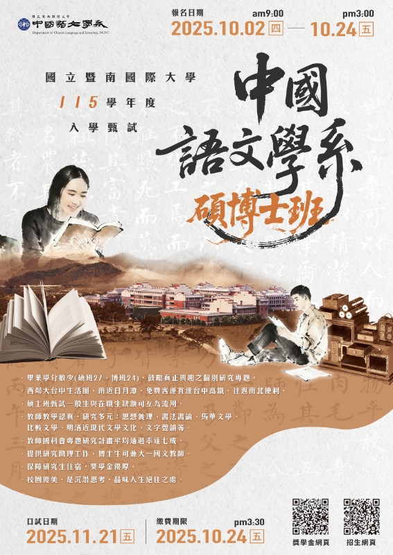 | 標題 | 國立暨南國際大學中國語文學系115學年度碩、博士班入學甄試開始報名,檢送招生海報電子檔 |
