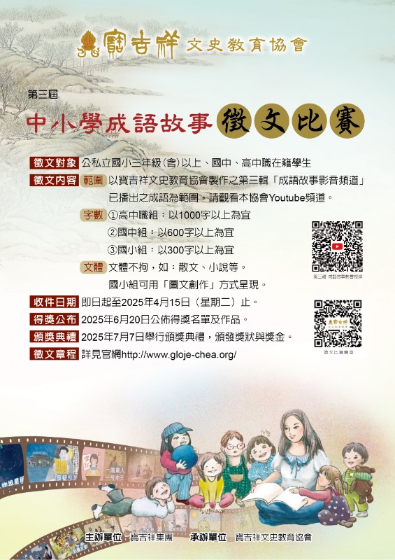 | 標題 | 寶吉祥文史教育協會第三屆中小學生成語故事徵文比賽~獎金三千元唷! |