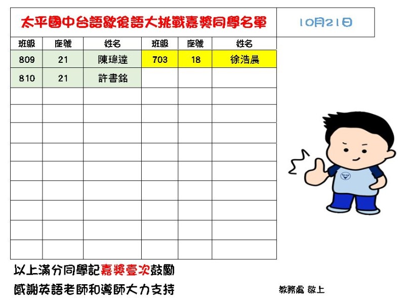 太平國中台語歇後語大挑戰嘉獎同學名單