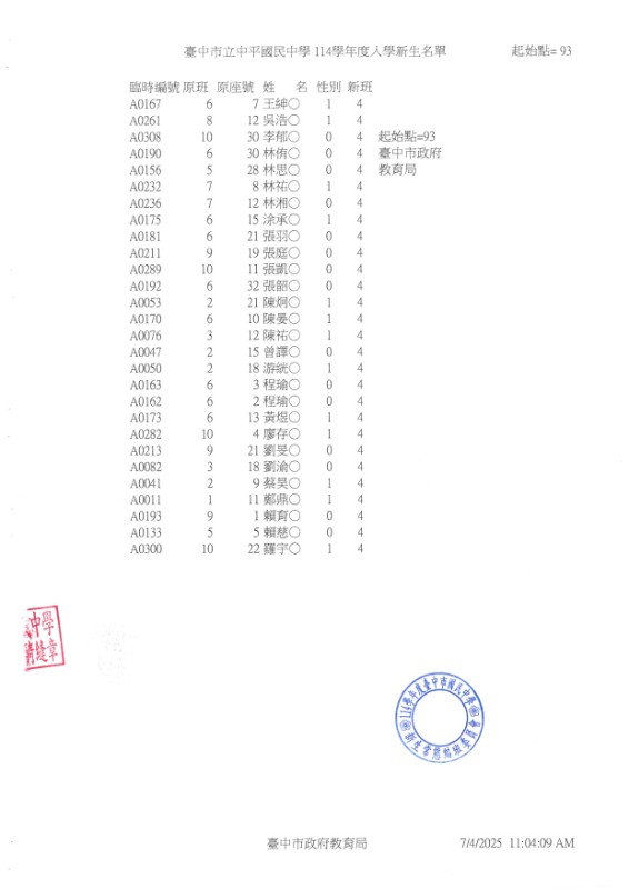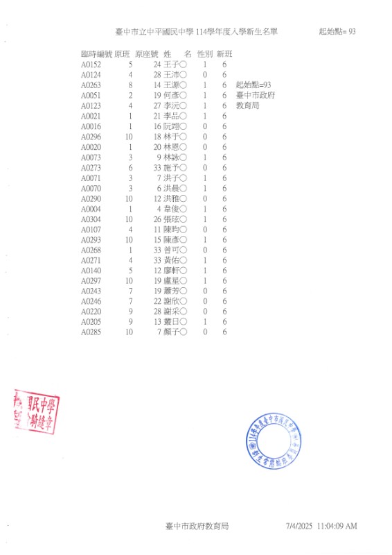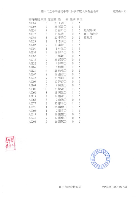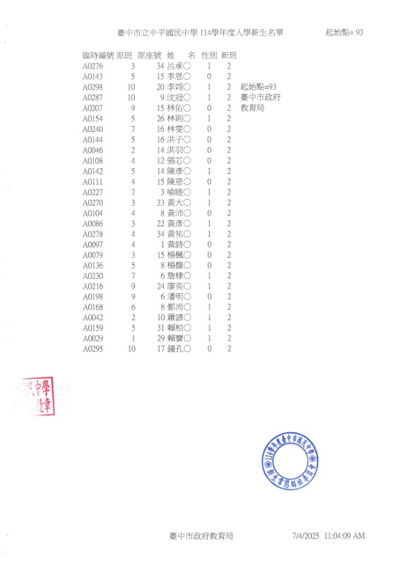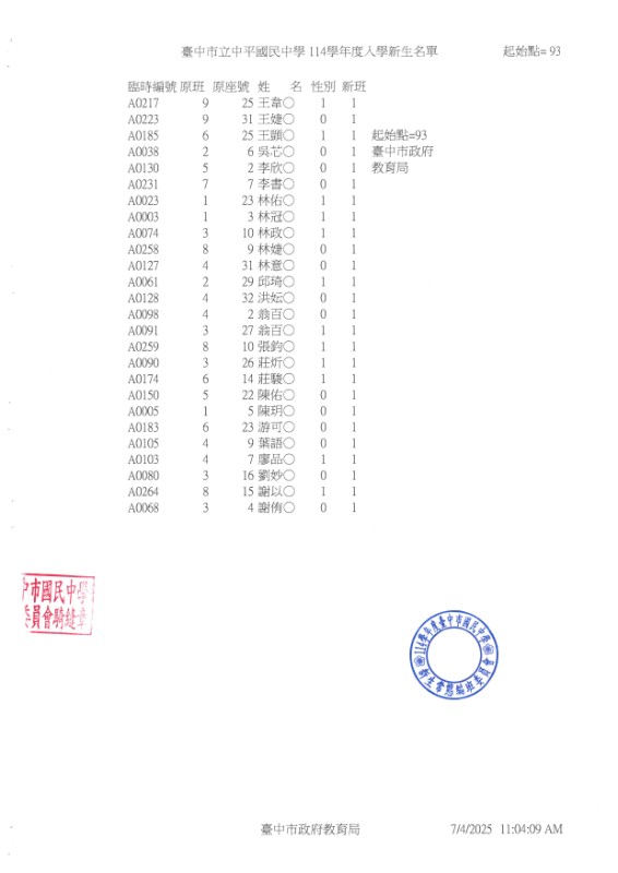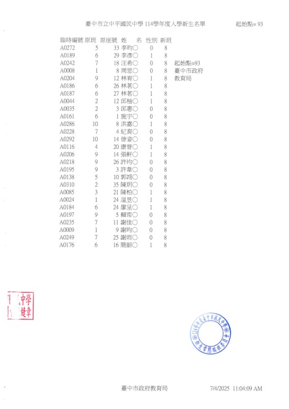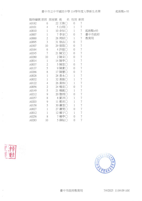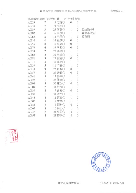 公告114學年度臺中市中平國中新生常態編班完成名冊