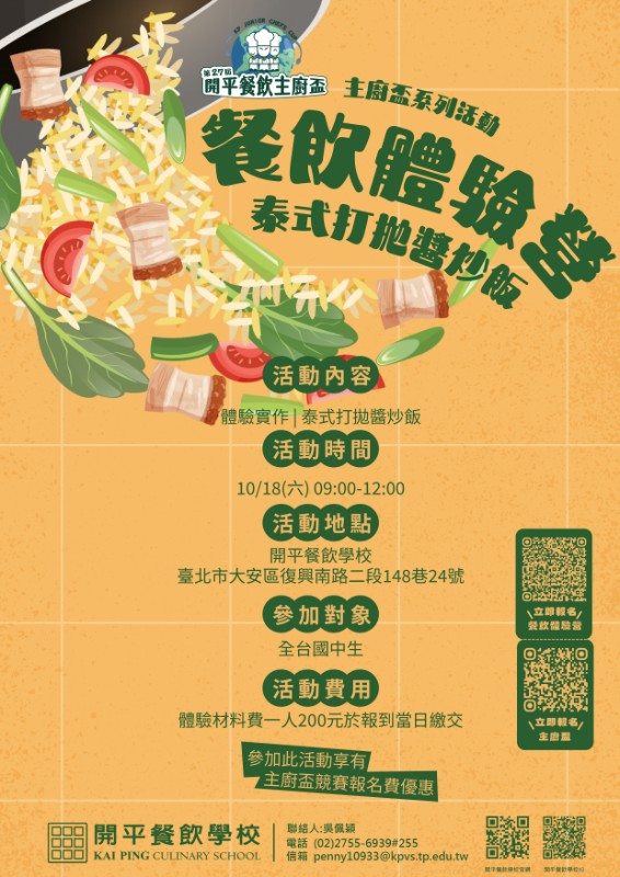 本次活動結合第27屆主廚盃國中競賽活動,透過「泰式打拋醬炒飯」實作體驗更加了解技職教育,以料理展現自我、創造未來無限可能。