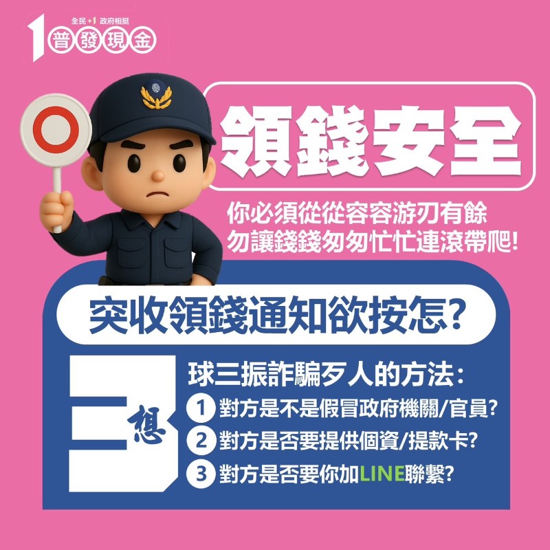 【普發現金】來啦 但開心的同時,也要提高警覺,小心詐騙! 千萬不要點陌生連結、輸入個資或帳號密碼! |