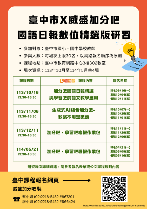 主旨: 有關本市「推動中小學數位學習精進方案」國語日報數位精選版113學年實體研習課程,請鼓勵所屬參加,並惠予公(差)假登記暨課務排代,請查照。 說明: 一、 依據「推動中小學數位學習精進方案」113年中小學實施計畫辦理。 二、 為使各校了解全市授權之「國語日報數位精選版」及其平臺操作與應用方式,特辦理系列研習課程。 三、 研習資訊如下: (一) 時間:113年10月16日(星期三)至114年5月21日(星期三)期間,共辦理4場次,各場次時間詳如附件實施計畫。 (二) 地點:臺中市教育網路中心3樓302教室(臺中市太平區樹德一街136巷30號)。 (三) 參加對象:本市國中小教師,每場次上限30人,以報名時間序錄取。 (四) 報名網址:https://www.iots.tc.edu.tw/software/training/premium-learnmode。 四、 注意事項: (一) 參與人員依實際上課時數核予研習時數(簽到退需填寫教師身份證字號),請於研習前10-15分鐘簽到。 (二) 加分吧平臺請使用本市教育雲端帳號登入。 五、 檢附本案實施計畫及海報各1份,如有疑問,請逕洽承辦人: (一) 蔡小姐,電話:(02)2218-5452分機867291,信箱:gilliantsai@via.com.tw。 (二) 廖小姐,電話:(02)2218-5452分機866424,信箱:shireneliao@via.com.tw。