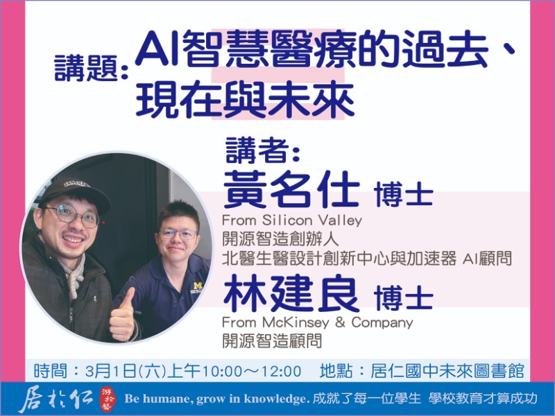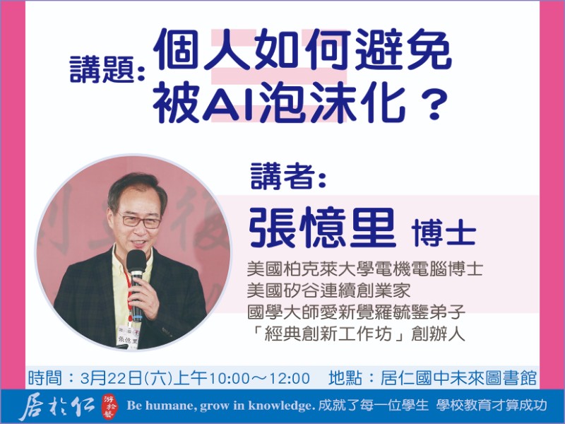 主旨: 檢送本校辦理114年臺中市立居仁國民中學2025年-AI元年-AI論壇講座主體海報及3月份講座文宣共3份,敬請貴校惠予協助於官網及臉書宣傳並轉知踴躍參與講座,請查照。 說明: 一、 依據本校2025年-AI元年AI思維x領導力~打造未來領袖計畫實施計畫辦理。 二、 旨揭AI論壇系列課程期協助學生建立AI基本概念、發展現況及應用的初步了解;透過實作體驗,培養學生對AI的興趣及學習動機,啟發學生對AI倫理及未來發展的思考。 三、 本系列講座預計共計辦理8場,相關資訊如下: (一)03/01日-AI智慧醫療的過去、現在與未來。 主講人:林建良博士、黃名仕博士 (二)03/22日-個人如何避免被AI泡沫化? 主講人:張憶里博士 (三)04/12-AI、假訊息與事實查核。 主講人:黃兆徽執行長 (四)04/19-AI變動時代核心不變的思維與能力。 主講人:楊光磊前研發長 (五)06/04-跟世界說台灣的故事。 主講人:鄭凱駿教授 (六)07/05-海洋中的靈長類:頭足動物的變色絕技與決策行 為。 主講人:焦傳金前館長 (七)07/19-AI與腦波。 主講人:姜琇森教授 (八)09/20-AI與律、法工作的未來與因應。 主講人:張凱鑫教授 四、 辦理時間及地點: (一)辦理時間:上述活動日期上午10:00~12:00。 (二)辦理地點: 第一會場:本校未來圖書館。 第二會場:本校大禮堂。 五、 檢附本次講座活動相關宣傳文宣共3份供參,敬請貴校惠予協助於官網及臉書宣傳並轉知,同時鼓勵貴校教師、家長及學生踴躍參與。