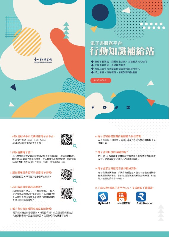 電子書服務平台提供24小時借閱服務,不受時間及地點的限制,電子書整合查詢入口網:https://www.library.taichung.gov.tw/ebook。