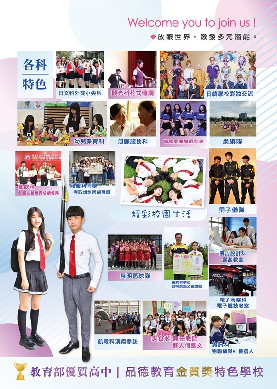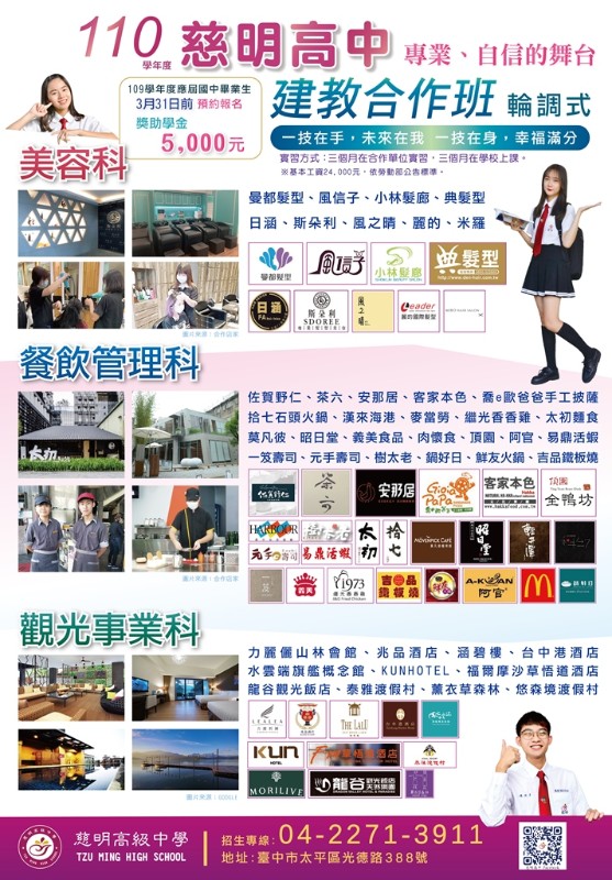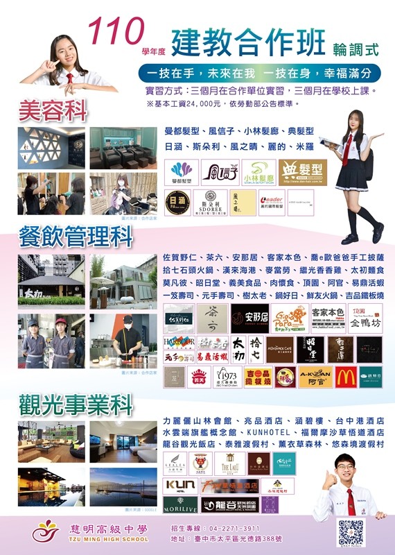 說明: 一、 慈明高中109學年度起招收「建教班」,計有52所國中學生來校就讀。二、 110學年度計開設有「餐飲管理科」、「觀光事業科」、「美容科」輪調式建教合作班。三、 建教合作班可讓學生邊工作邊讀書,讓經濟弱勢的學生可以自食其力完成學業,減輕家庭的負擔。四