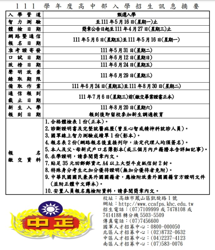 中 正 國 防 幹 部 預 備 學 校 111 學年度 高中部 入 學 招生訊息 摘要如下 ![]()