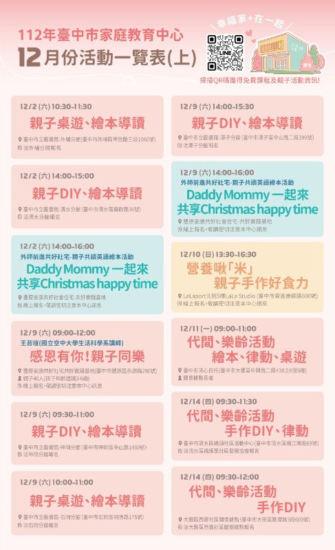 為促進本市家庭教育推展,以達成家庭教育法所定目標,檢送本中心112年12月份活動一覽表及宣傳文稿各1份,請貴機關(學校)惠予協助於官方網頁及相關媒體平台宣傳。