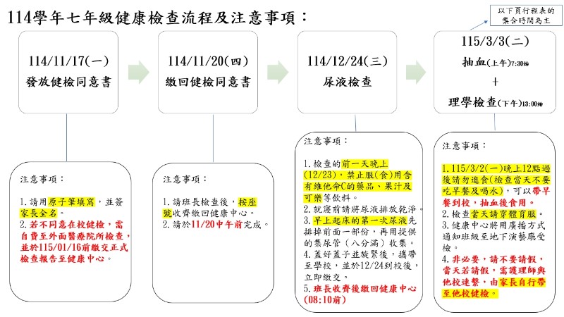| 標題 | 114學年七年級新生健檢時程及注意事項 |
