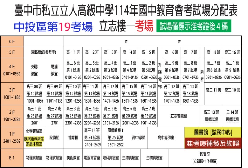 | 標題 | 114年國中教育會考-中投區第19試場立人高中考場 試場分配表 |