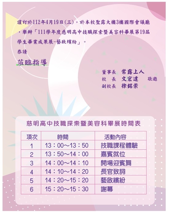 為協助國三學生認識技職內涵,以利生涯探索,於112年4月19日(三)辦理111學年度技職探索暨美容科畢展活動,敬請蒞臨指導。