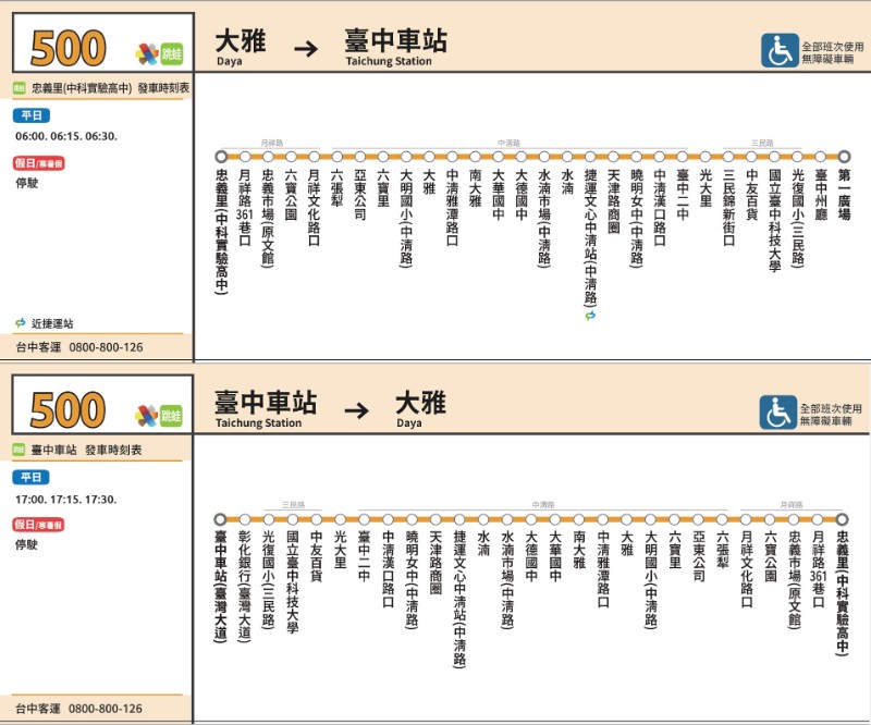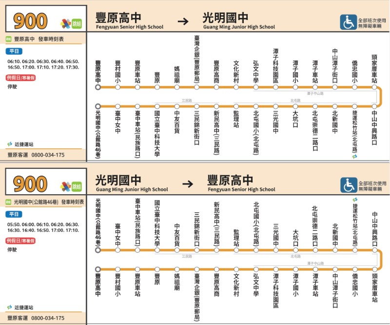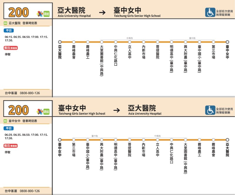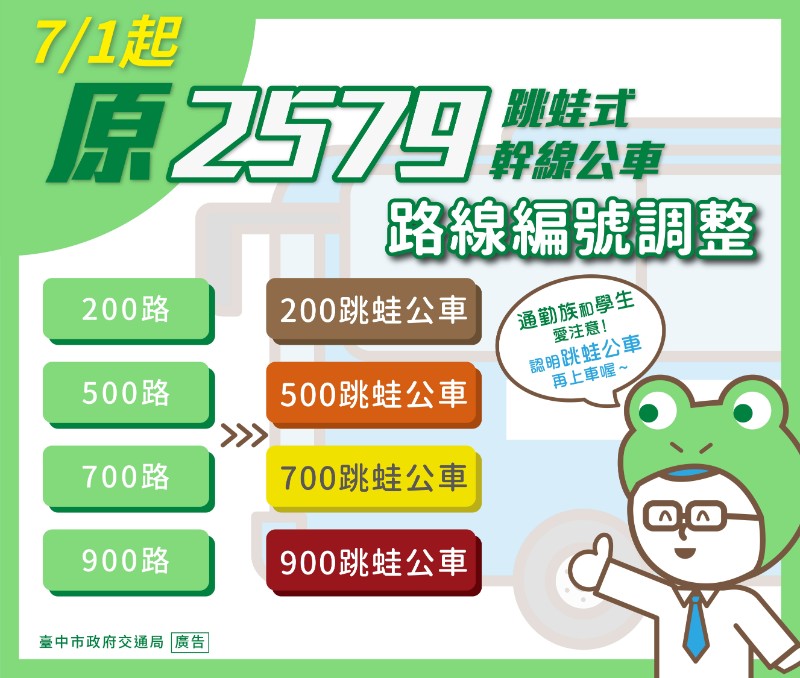 一、依據臺中市政府交通局111年8月17日中市交公捷管字第1110043605號函辦理。 二、配合本市幹線公車政策推動,自本(111)年7月1日起,原於通學通勤時段營運的200路「霧峰農工-臺中女中」、500路「忠義里(中科實驗高中)-臺中車站」、700路「明德高中-豐原高中」及900路「光明國中-豐原高中」公車,已調整路線編號如下: (一) 原200路:調整為「200跳蛙公車」。