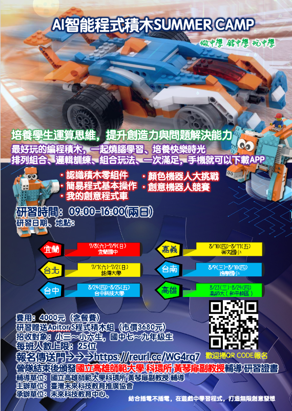 費用:4000元(含餐費)研習贈送Apitor S程式積木組(市價3680元)。 |