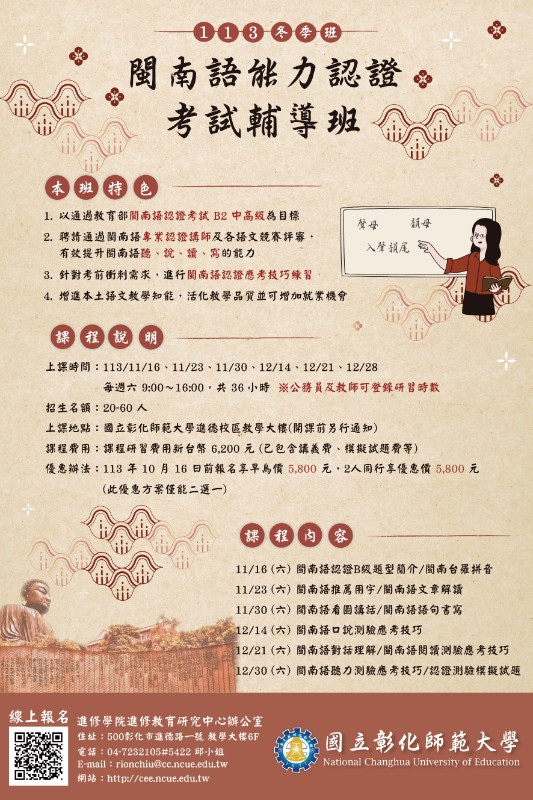 一、「113年閩南語能力認證考試輔導班(冬季班)」 (一) 課程特色:本班以通過教育部閩南語認證考試B2中高級為目標,聘請通過閩南語認證專業講師及各語文競賽評審,有效提升閩南語聽、說、讀、寫的能力。 (二) 課 程 時 間 :113年11月16日~113年12月28日,週六 9:00~16:00,6天合計36小時,公務人員及教師可登錄研習時數。 (三) 課程費用:6,200元(含講義費、模擬試題費等)。10/16前報名享早鳥價 5,800元,兩人以上同行每人享優惠5,800元,此優惠方案僅能二選一。 二、報名步驟:線上報名,請至本校進修學院報名管理系統報 名 。 如 第 一 次 報 名 , 請 先 申 請 帳 號 。(https://aps.ncue.edu.tw/cee/index.php) 三、相關資訊請詳閱課程招生簡章,如有相關問題,請向本校進修學院進修教育研究中心洽詢:(04)723-2105分機5422邱小姐,E-mail:rionchiu@cc.ncue.edu.tw。
