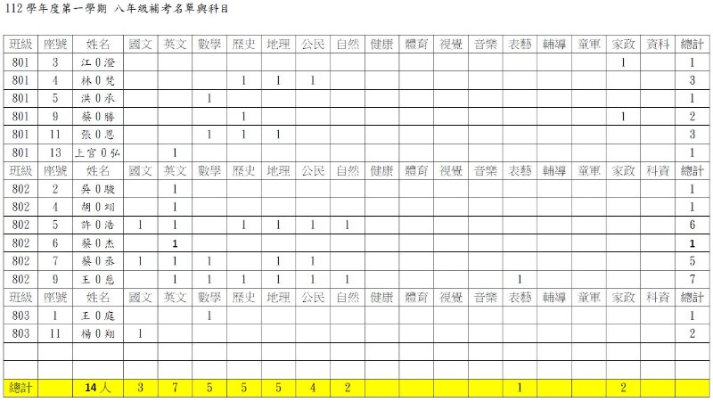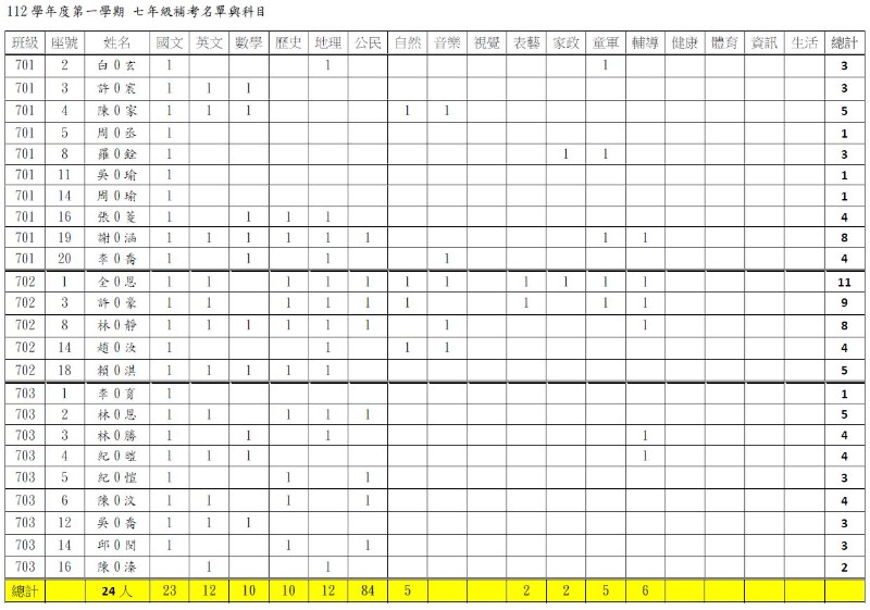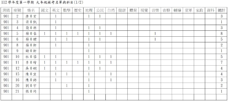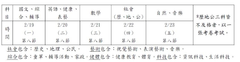 *補考題庫,請至學校首頁左邊欄位下方的112-1補考題庫專區自行下載!! *補考科目與時間如下表,地點:本校多功能(七、八年級)、圖書館(九年級)。