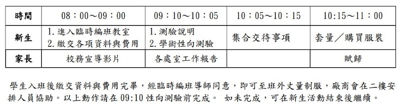 | 標題 | 本校4/20(六)早上8:00辦理113學年度新生入學報到,臨時編班、流程表、配置圖等資訊,請參閱內文 |