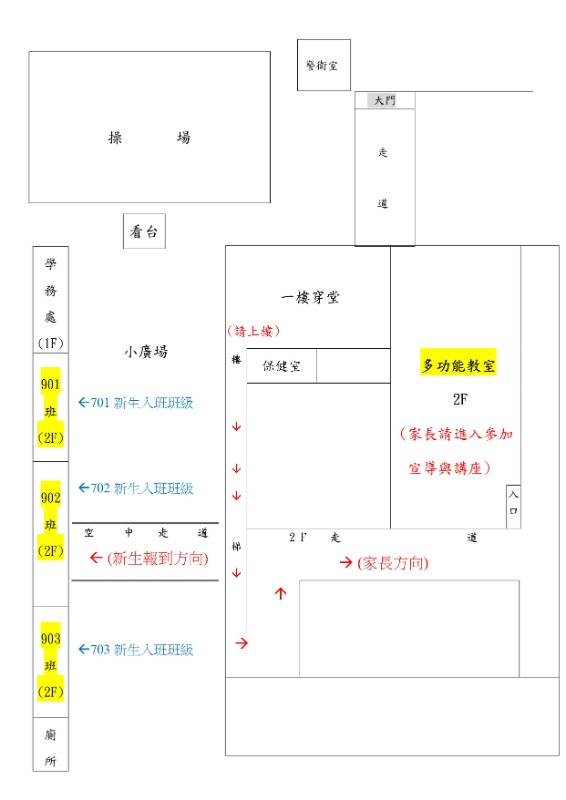 當天入班皆有本校學長姊公差指引,請家長放心。並請務必在9:00~10:00移駕至本校多功能教室,由本校教職員同仁為各位進行校務宣導及各處室介紹。