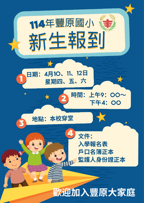 ★114年豐原國小新生報到★●日期:114年4月10~12日(星期四~六)●時間:上午9:00~下午4:00●地點:本校穿堂●攜帶文件:入學報名表、戶口名簿正本和影本、監護人身分證●應入學年齡:民國107年9月2日至108年9月1日出生者●入學報名表已寄送至戶籍地,再請家長留意●如有相關疑問請電洽04-25222066分機722 教務處李老師●本校學區豐原里1-22鄰(全里)、頂街里1-11鄰(全里)、中山里1-3鄰、中山里12-20鄰、4鄰信義街復興路54-60(偶數)號、56-1號、豐榮里1-19鄰(全里)、下街里1-9鄰、10鄰中正路232、236~250(偶數)號、忠孝街6~12(偶數)號、大湳里1-26鄰(全里)、北湳里1-24鄰(全里)、翁明里10-12鄰、朴子里10鄰、朴子里16-17鄰