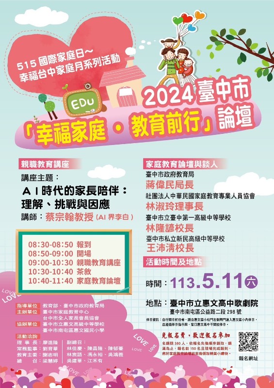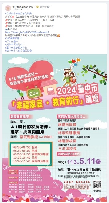 本市家庭教育中心辦理2024臺中市「幸福家庭·教育前行」論壇 |