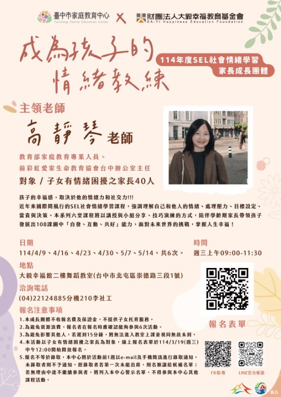 臺中市家庭教育中心辦理SEL社會情緒教育成長團體文宣1份,鼓勵相關家長報名參加。 |