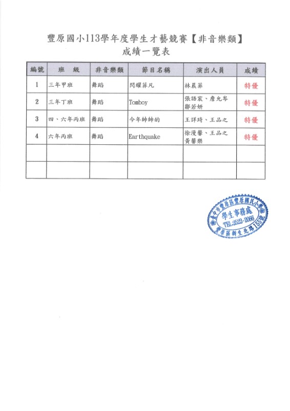 113學年度校內學生才藝競賽-非音樂類、音樂類A、B組成績公告