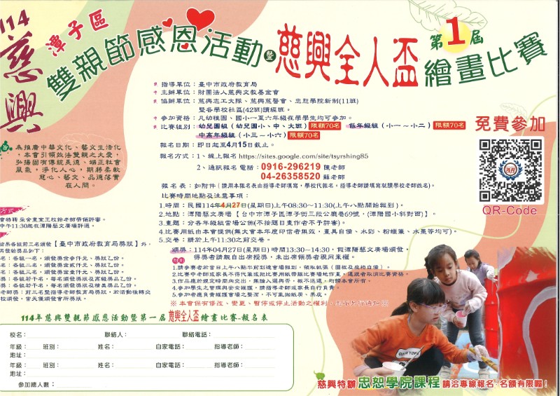 轉知潭子區慈興全人盃第1屆繪畫比賽訊息,有興趣者請參閱。