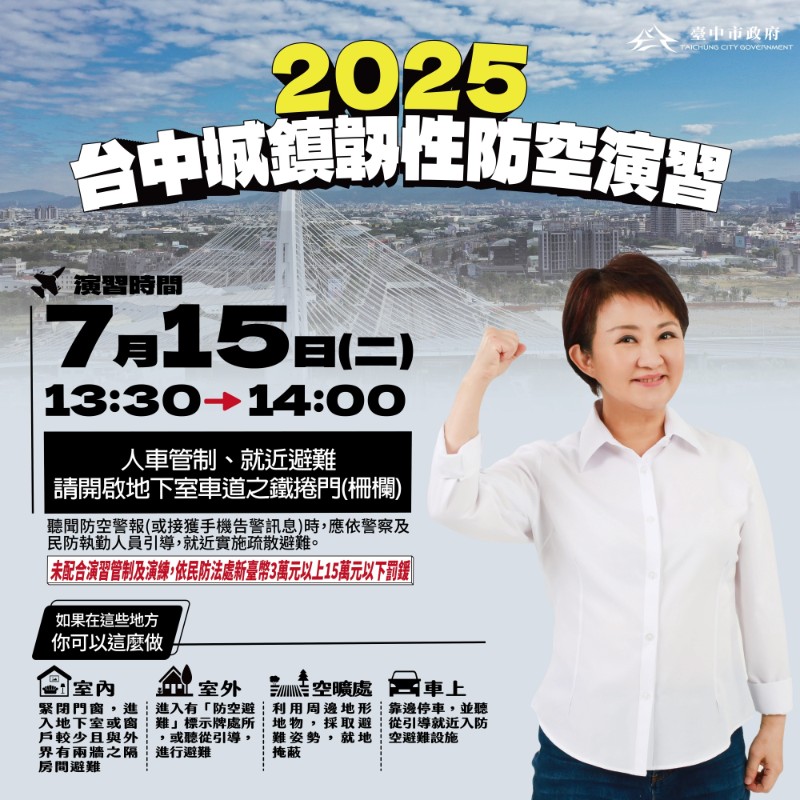 | 標題 | 臺中市2025城鎮韌性(防空)演習,114年7月15日進行疏散管制,敬請全民共同配合~ |