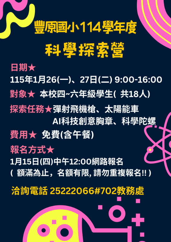活動日期與時間: 115年1月26(一)、1月27日(二)上午9:00-下午4:00。 招生對象:本校四~六年級學生 名額:18人(備取6人) 報名方式: 網路報名 網址:https://reurl.cc/mkQ7WV 或直接掃QR-code 報名時間: 115年1月15日(四)中午12:00開始, 額滿後自動關閉報名系統。 課程內容與報名QR-code 詳如附檔說明。 聯絡電話: 25222066分機702 教務處