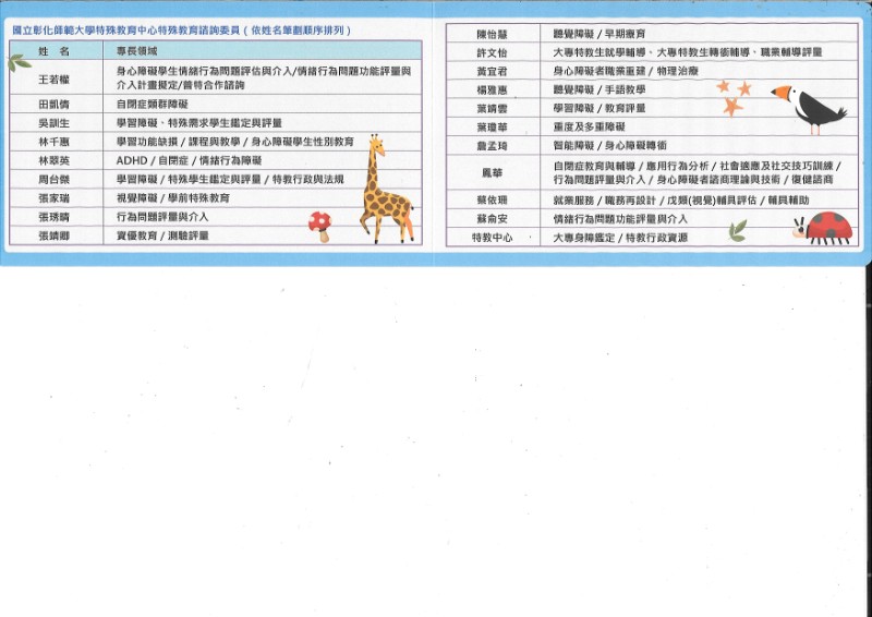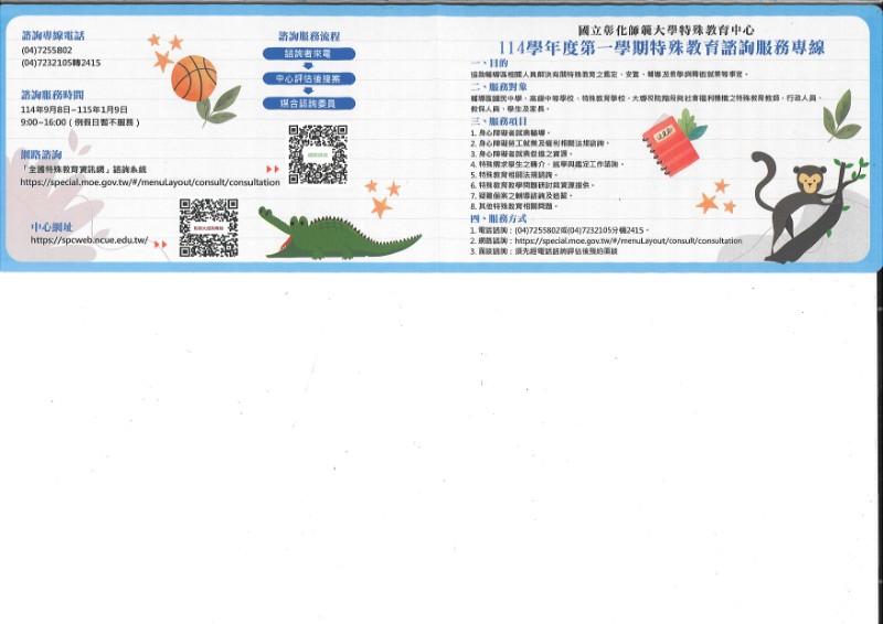 轉知「國立彰化師範大學特殊教育中心114學年度第1學期特殊教育諮詢專線服務」,諮詢方式請參閱附件。
