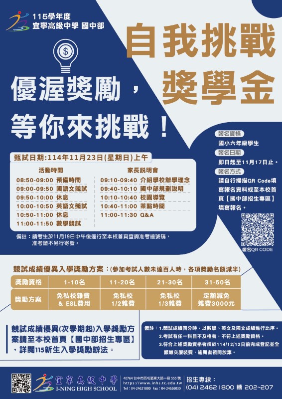 宜寧中學115學年度自我挑戰獎學金競試活動及潛能探索營暨家長說明會