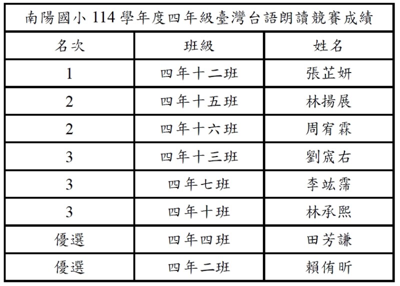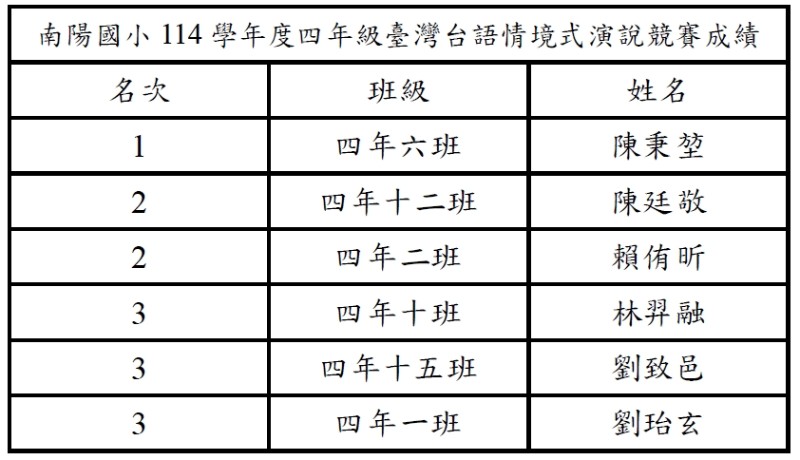 南陽國小114學年度四年級臺灣台語朗讀競賽成績.jpg