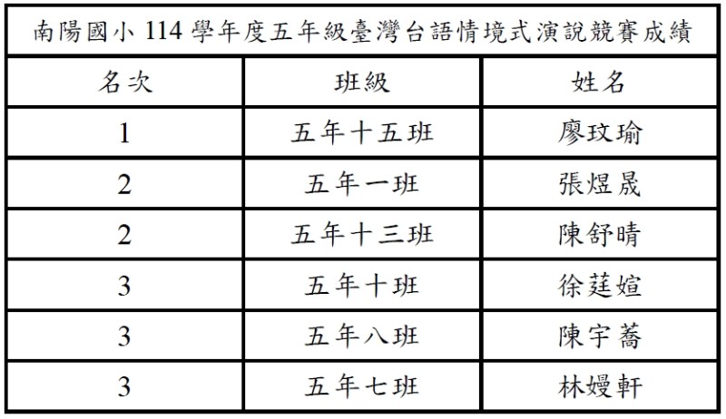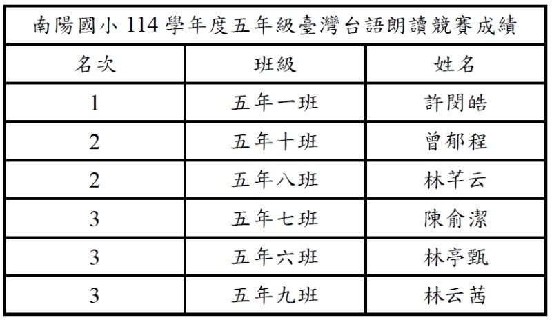 南陽國小114學年度五年級臺灣台語朗讀競賽成績.jpg
