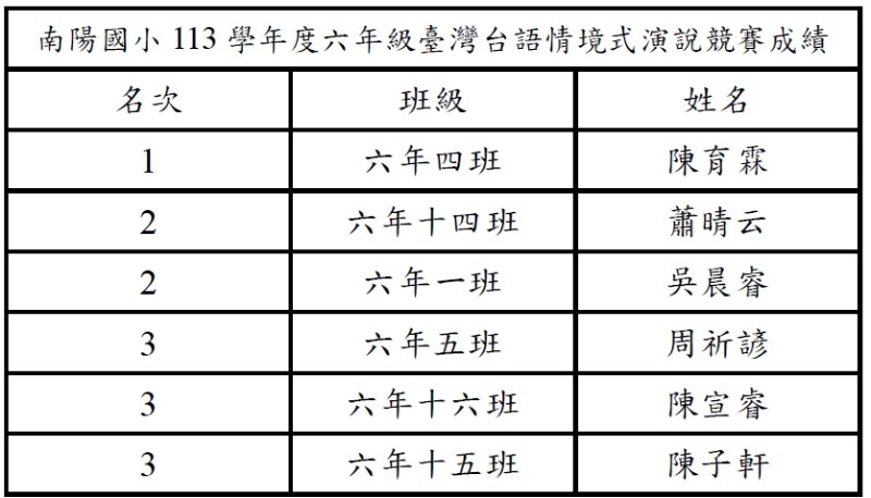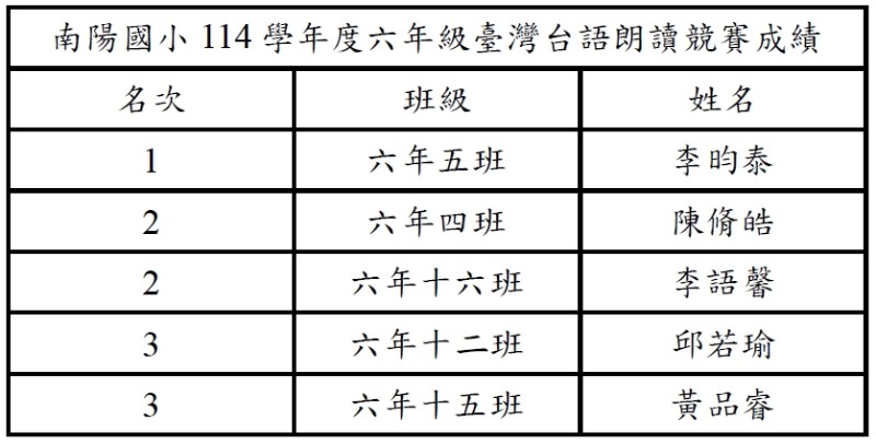 南陽國小114學年度六年級臺灣台語朗讀競賽成績.jpg