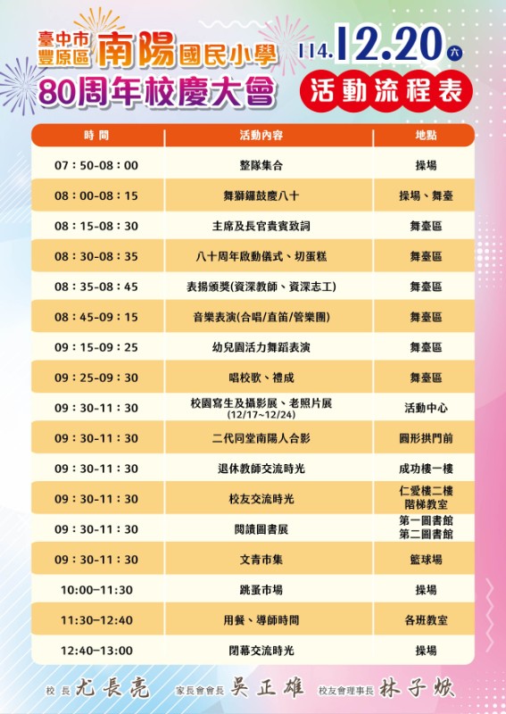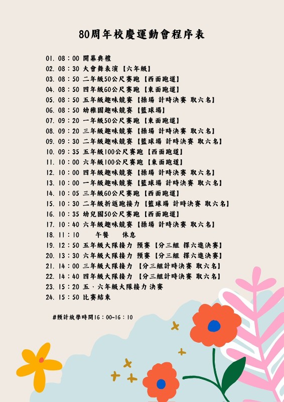 本校於12/19(五)舉辦運動會,12/20(六)舉辦80周年校慶,附上流程時間表,敬邀各位家長蒞臨參加。