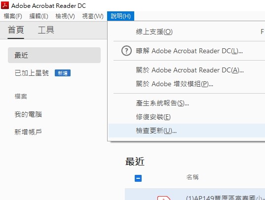 請同仁記得 開啟 Acrobat Reader DC \ 說明 \ 檢查更新 更新至最新版即可