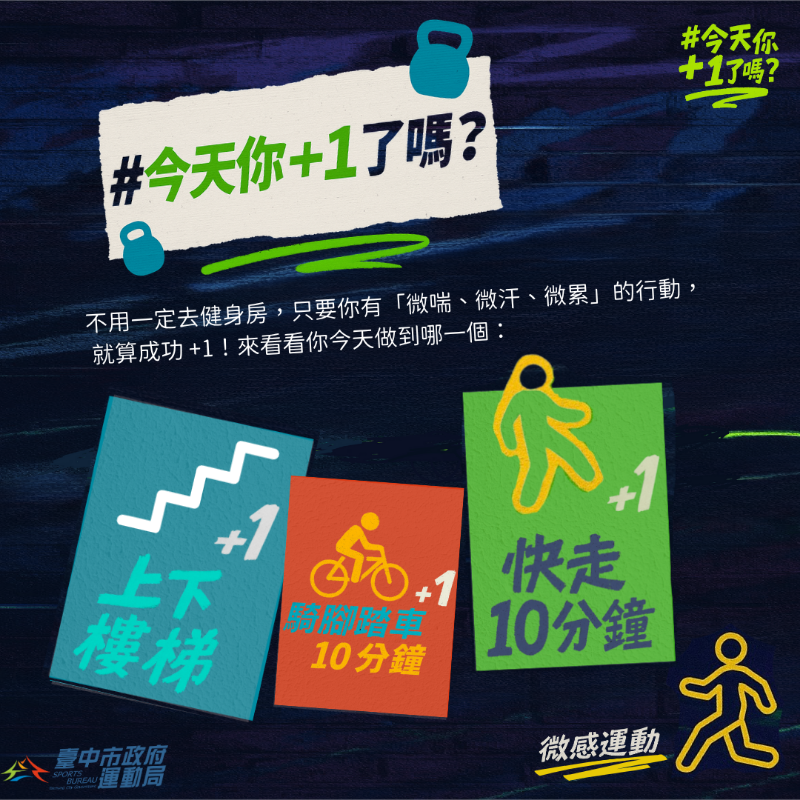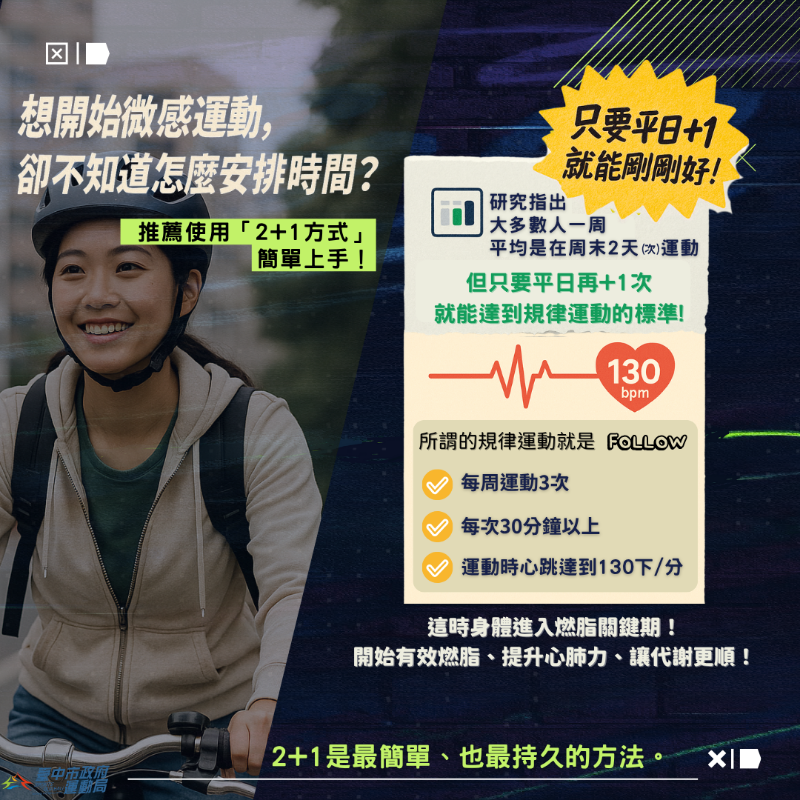 💡 想開始運動,卻總是找不到時間?不如從最簡單的開始 #微感運動2加1!♀️【2+1運動法】每週只要週末運動2天,再加上平日任選1天運動,就能輕鬆達到規律運動的標準!✔️ 每週運動3次✔️ 每次30分鐘以上✔️ 心跳達到每分鐘130下♂️【微感運動怎麼做?】只要做到「微喘、微汗、微累」,就算成功 +1!✅ 你今天+1了嗎?從微感開始,每一小步都是改變的起點。現在就動起來,一起加1更健康!#規律運動超簡單