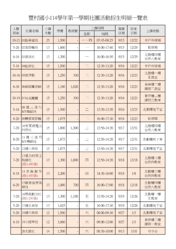 親愛的家長您好,本校114學年第一學期社團活動即將於8/27(三)開放報名,請留意下方公告訊息: 一、報名期程:8/27(三) 6:00 至 9/1(一) 23:59 二、報名網址:https://www.beclass.com/rid=30500ca68ad559c19482 三、錄取方式:線上報名時間截止後若超過招收人數上限,將統一於學務處公開抽籤決定錄取名單 四、錄取公告:9/3(三)17:00前確定開班之社團及錄取名單公告於學校網站,屆時請上網查詢且不再個別發開課通知,如有疑義請於9月4日(四)中午12:00前來電洽詢。