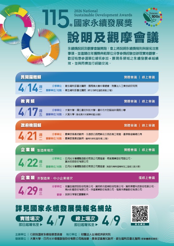 「115年國家永續發展獎選拔表揚計畫」、說明及觀摩會議海報及相關資訊 |