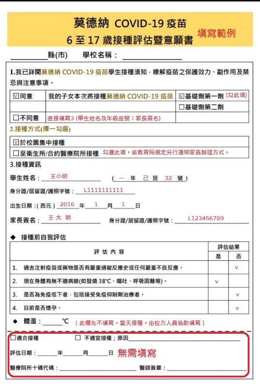 (三)請家長填寫「莫德納COVID-19疫苗 6-17歲接種評估暨意願書」。