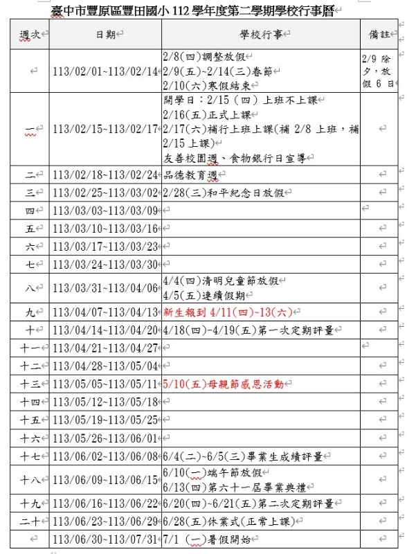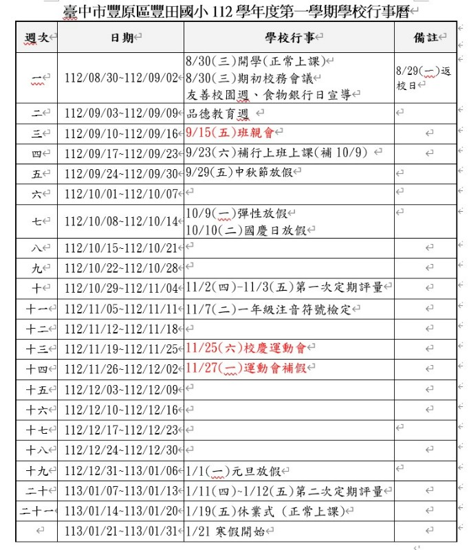 〈公告〉臺中市豐原區豐田國小_112學年度學校行事曆(上、下學期)