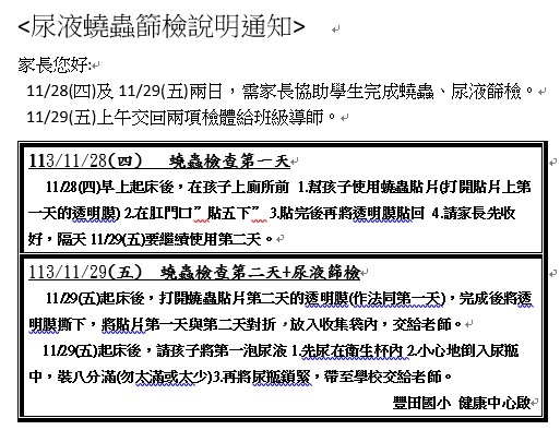 一、四年級學生,尿液蟯蟲篩檢說明通知