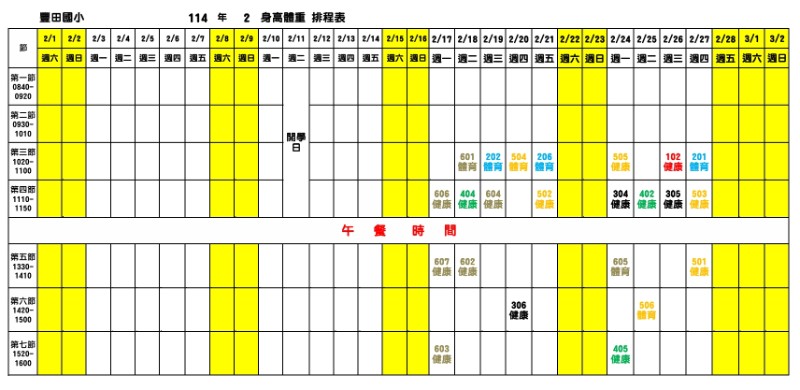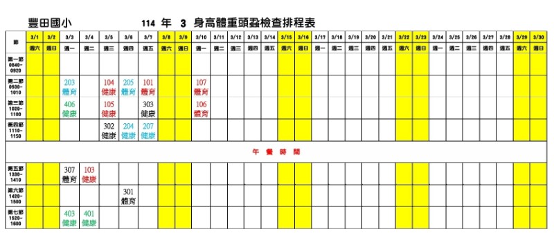 | 標題 | 113學年度下學期<各班身高體重視力頭蝨檢查排程表> |