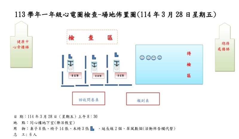 113學年度 一年級學童心電圖檢查 日期:114年03月28日(五) 時間:上午8:40 地點:同心樓 地下室一樓 樂活教室 檢查單位:心臟病兒童基金會