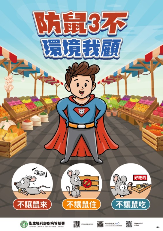 一、落實「不讓鼠來、不讓鼠住、不讓鼠吃」防鼠三不政策 二、防火巷、排水設施(下水道、水溝蓋)、雜物堆、牆垣為鼠類族群活動熱區,請針對該等特定環境加強捕鼠與滅鼠工作。 本宣導資料由【衛生福利部疾病管制署】提供。 ★關漢他病毒症候群相關防治及衛教資訊,可至疾管署全球資訊網(https://www.cdc.gov.tw)傳染病與防疫專題/傳染病介紹/漢他病毒症候群項下查閱。 ★漢他病毒症候群為人畜共通傳染病,在自然界的傳播宿主為鼠類等齧齒類動物,人類一旦吸入或接觸遭帶有漢他病毒鼠類排泄物或分泌物(包含尿液、糞便、唾液)污染之飛揚塵土、物體,或是被帶有病毒之齧齒類動物咬傷或抓傷,即有可能受到感染。