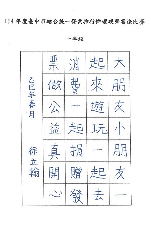 恭喜本校師生參加114年度臺中市結合統一發票推行辦理硬筆書法比賽榮獲佳績 獲獎名單: 一年五班 徐立翰 一年級佳作 三年二班 魏呈緯 三年級優選 五年一班 楊恒碩 五年級優選 廖建壹老師 社會組特優 感謝建壹老師、佩君老師、各班導師指導
