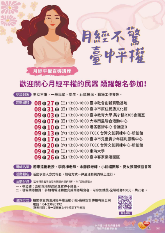 社會局辦理「114年度月經平權宣導講座」,歡迎民眾踴躍參加 活動資訊及報名方式參連結 https://www.surveycake.com/s/aGdvx 或電洽社會局月經平權活動小組(高碲設計傳播有限公司林小姐,04-23820192分機18)