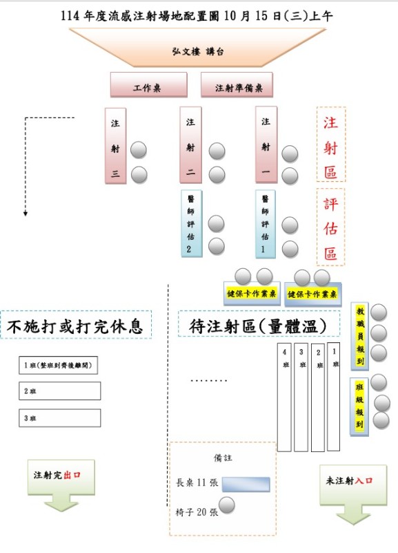 一、時間:114年10月15日(星期三)早上8:30開始 二、地點: 弘文樓2樓 (場地圖如下) 三、接種時間: (會依現場作業情況,調動時間)