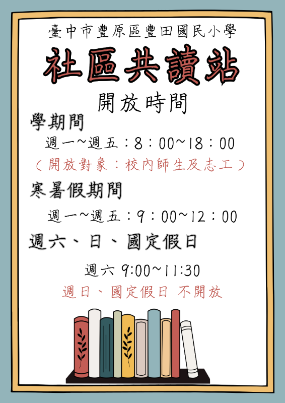 | 標題 | 豐田國小社區共讀站開放時間及注意事項 |
