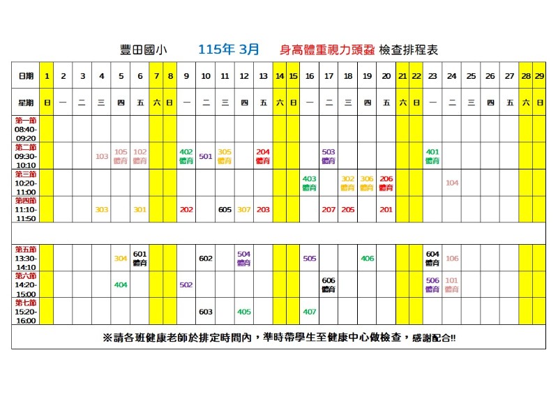 | 標題 | 114學年度下學期<各班身高體重視力頭蝨檢查排程表> |
